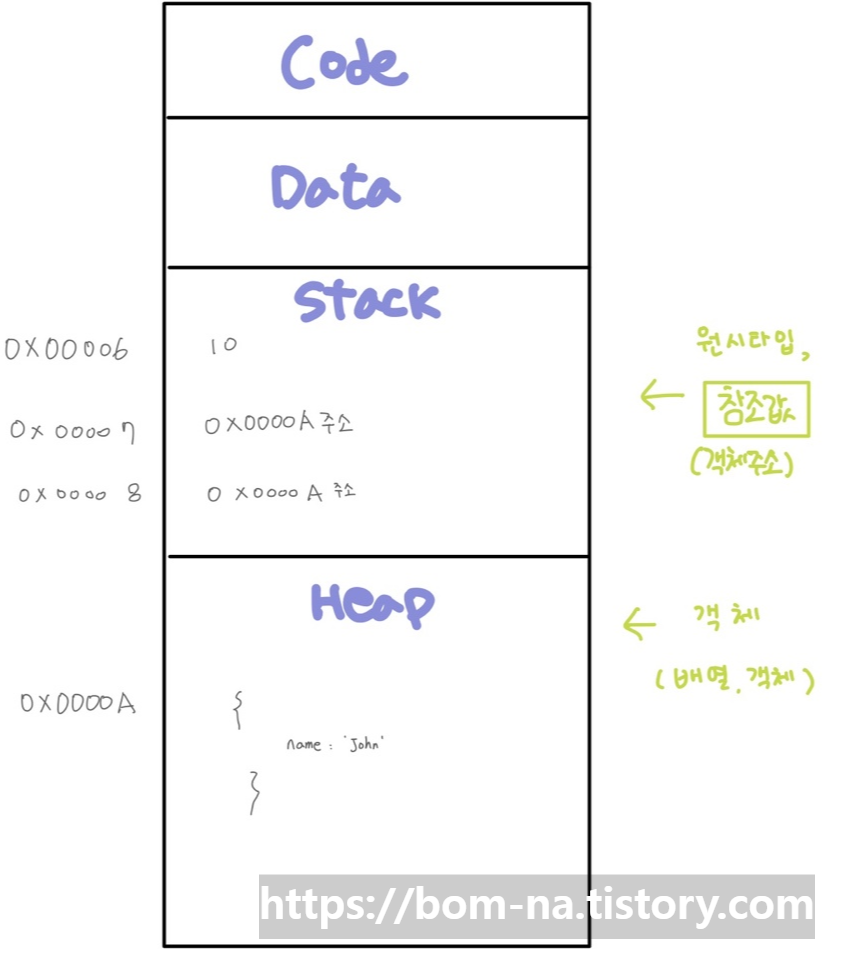 원시타입은 Stack, 객체는 Heap에 저장됨!